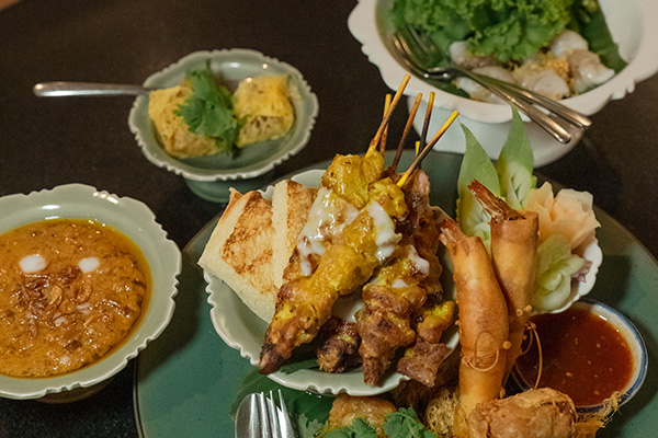 Enjoy delicate steamed rice dumplings filled with tender minced chicken and fragrant roasted peanuts, alongside crisp egg thread rolls and juicy pork satay grilled to perfection.